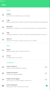 – Buoy sử dụng các thiết lập ẩn trong Android để chỉ định hành vi tùy chỉnh cho chế độ tiết kiệm pin tích hợp sẵn. Các tính năng bao gồm các công tắc sau đây: