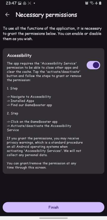Bật “Accessibility” lên từ trong cài đặt, khi bật thì mới dùng được hết công hiệu của app game booster nhé