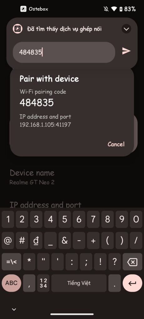 B2: Nhấn nút Pair , cấp quyền thông báo cho app .Sau đó mở tuỳ chọn nhà phát triển trong cài đặt -> Bật gỡ lỗi wifi -> Ghép nối thiết bị bằng mã ghép nối.